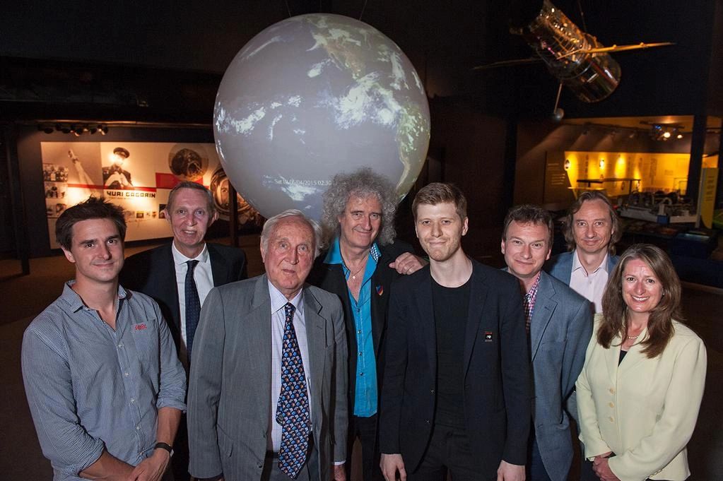 Asteroid Day June 30th 2015 L-R Lewis Dartnell, Prof Richard Crowther, Sir Crispin Tickell, Dr Brian May, Grig Richters, Alan Fitzsimmons, Dr Stuart Clark and Debbie Lewis. Photo credit Max Alexander